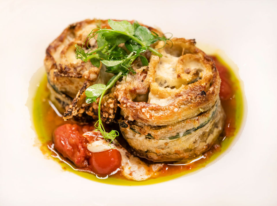 Baked Eggplant Rolls, Smoked Scamorza, Datterini, Tomato Sauce, Basil-Infused Olive Oil